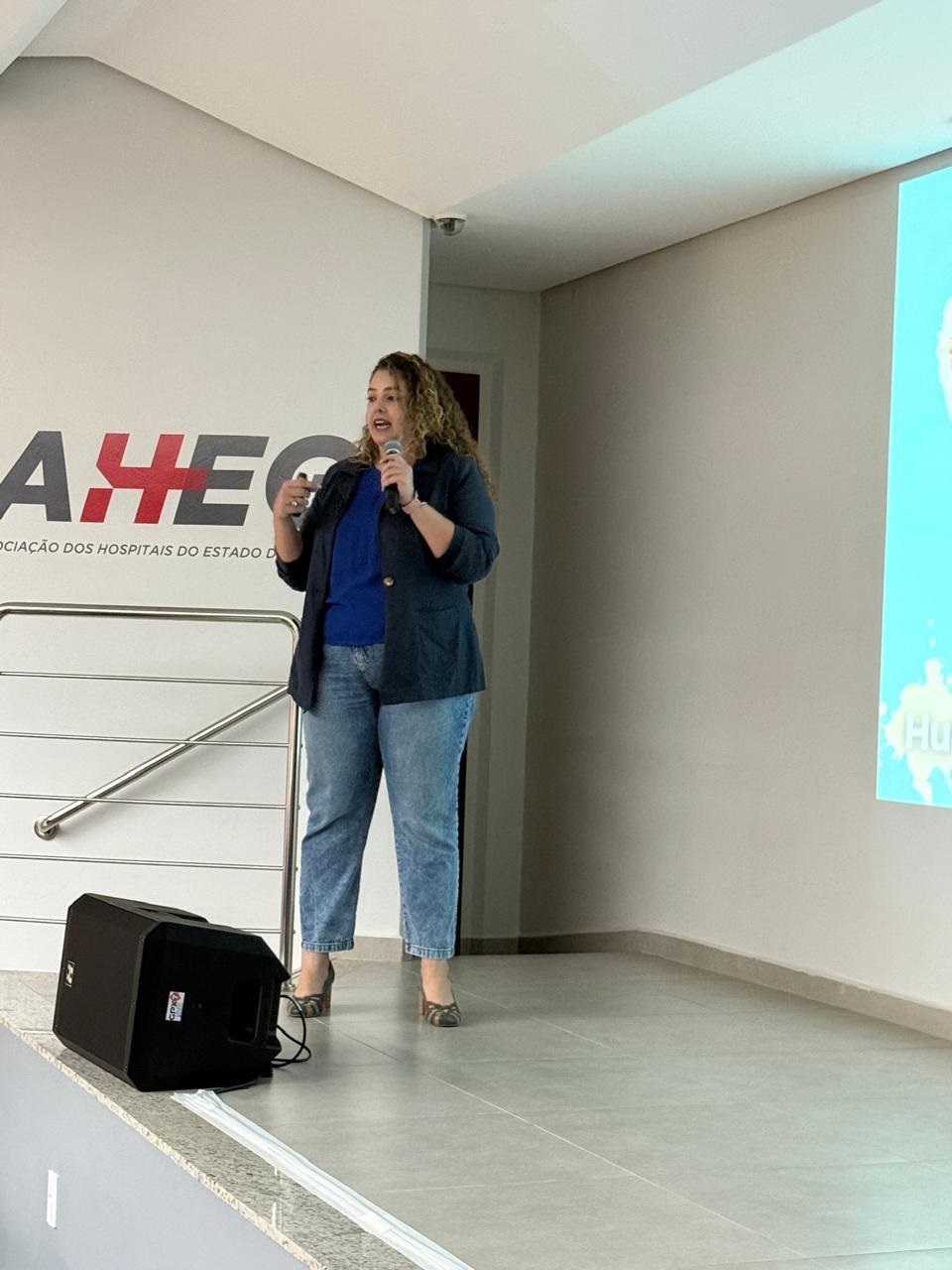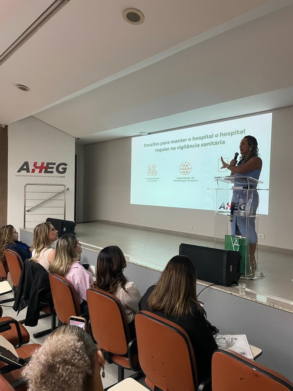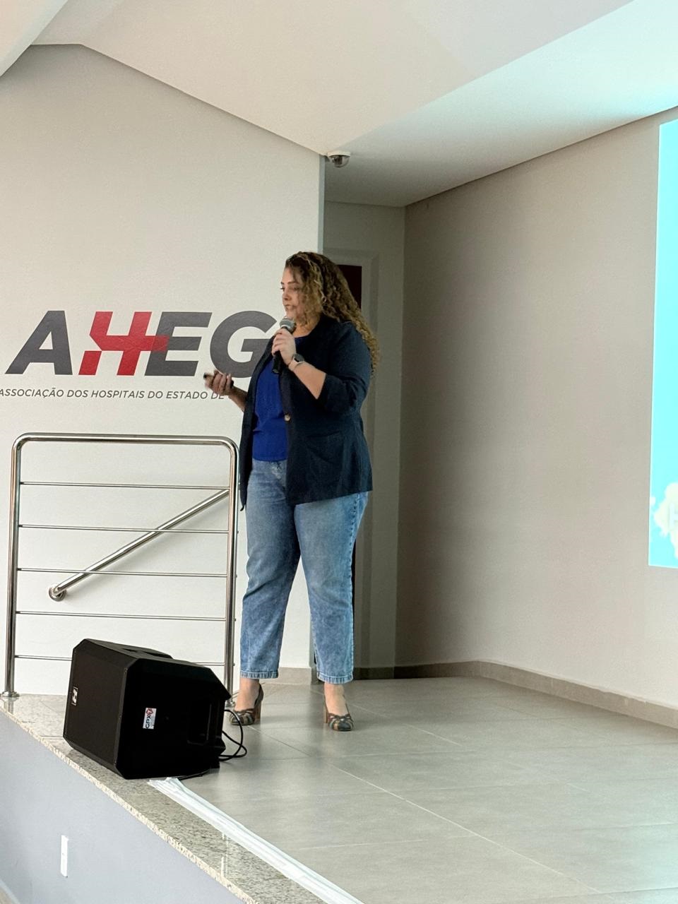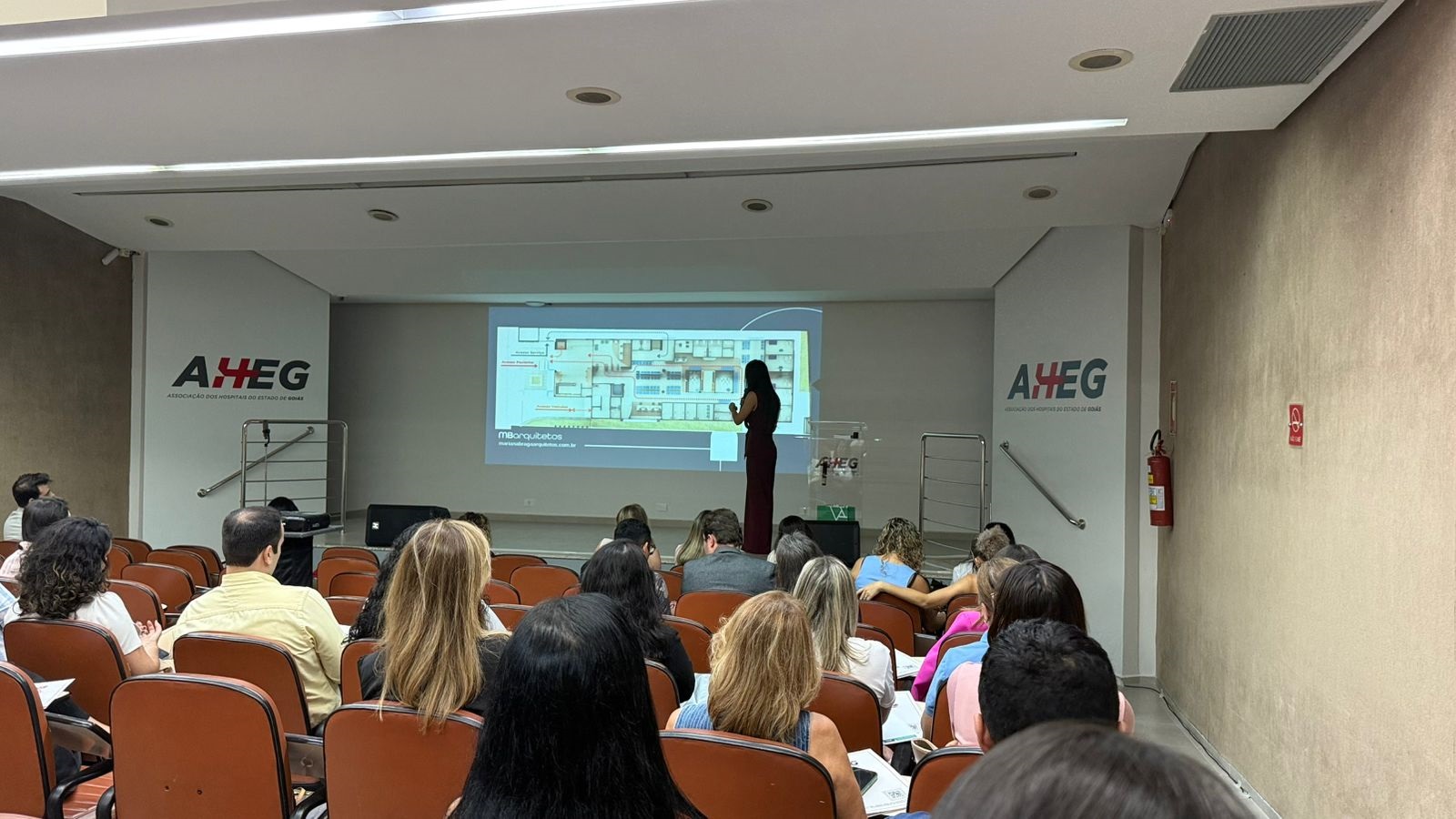 Em seguida, Amanda Marinho, diretora regional da ABDEH em Goiás e sócia-proprietária da Maral & Souza Arquitetura Saudável, apresentou a palestra "Infraestrutura Hospitalar Segura: como o atendimento às normas sanitárias reduz riscos e fortalece a gestão".