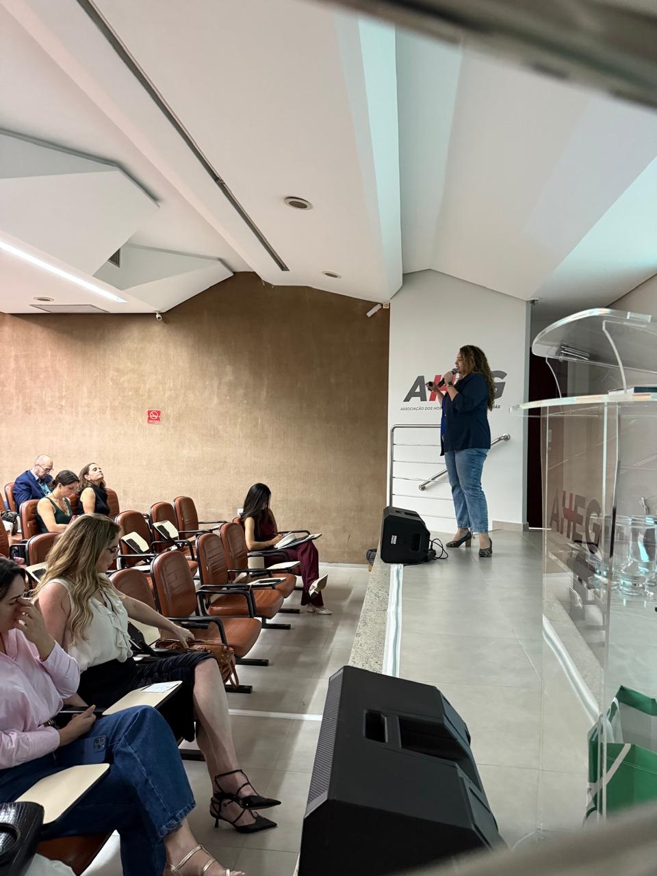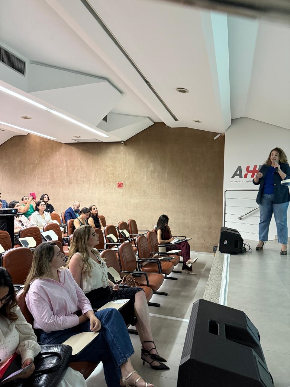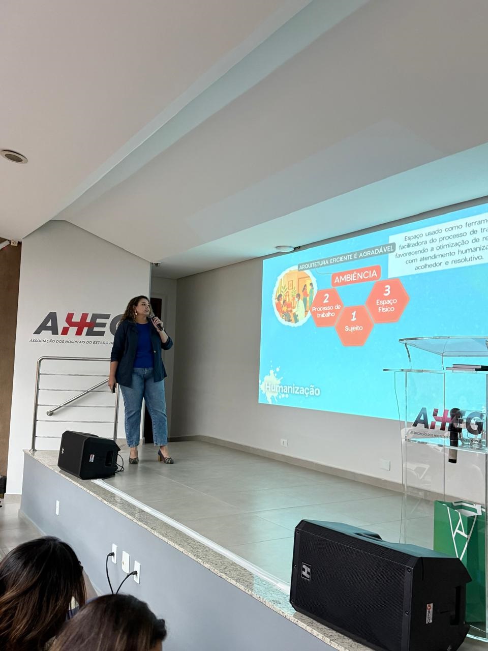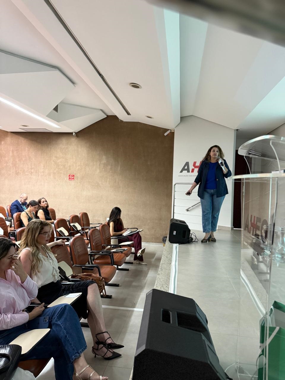 Em seguida, Amanda Marinho, diretora regional da ABDEH em Goiás e sócia-proprietária da Maral & Souza Arquitetura Saudável, apresentou a palestra "Infraestrutura Hospitalar Segura: como o atendimento às normas sanitárias reduz riscos e fortalece a gestão".