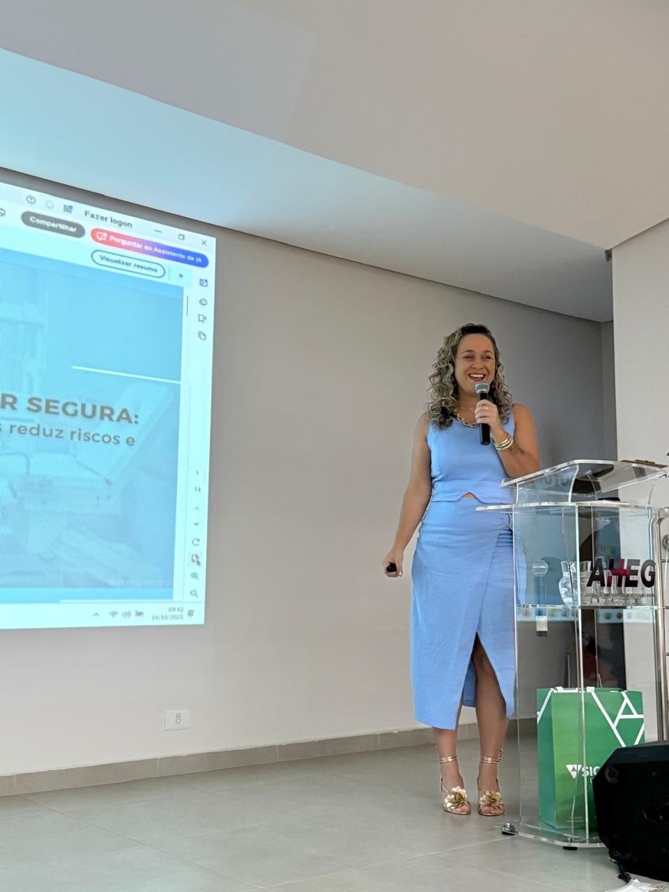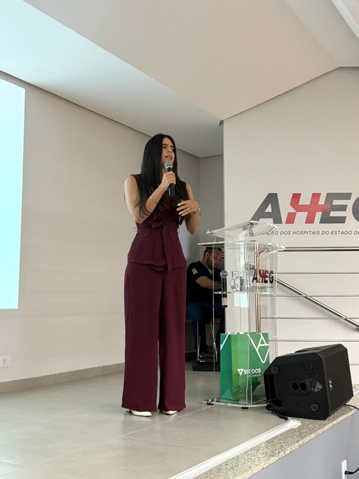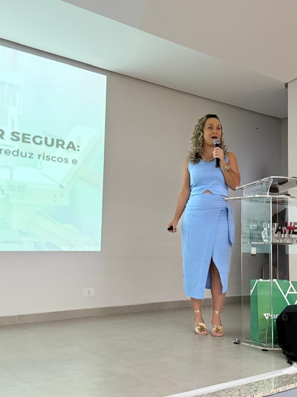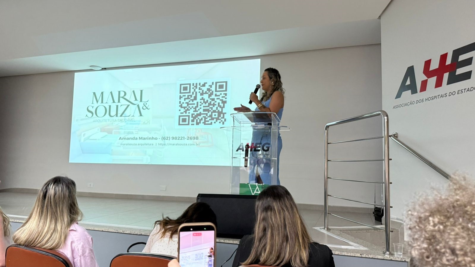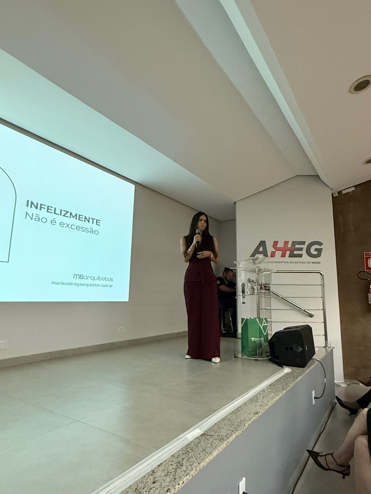 Em seguida, Amanda Marinho, diretora regional da ABDEH em Goiás e sócia-proprietária da Maral & Souza Arquitetura Saudável, apresentou a palestra "Infraestrutura Hospitalar Segura: como o atendimento às normas sanitárias reduz riscos e fortalece a gestão".