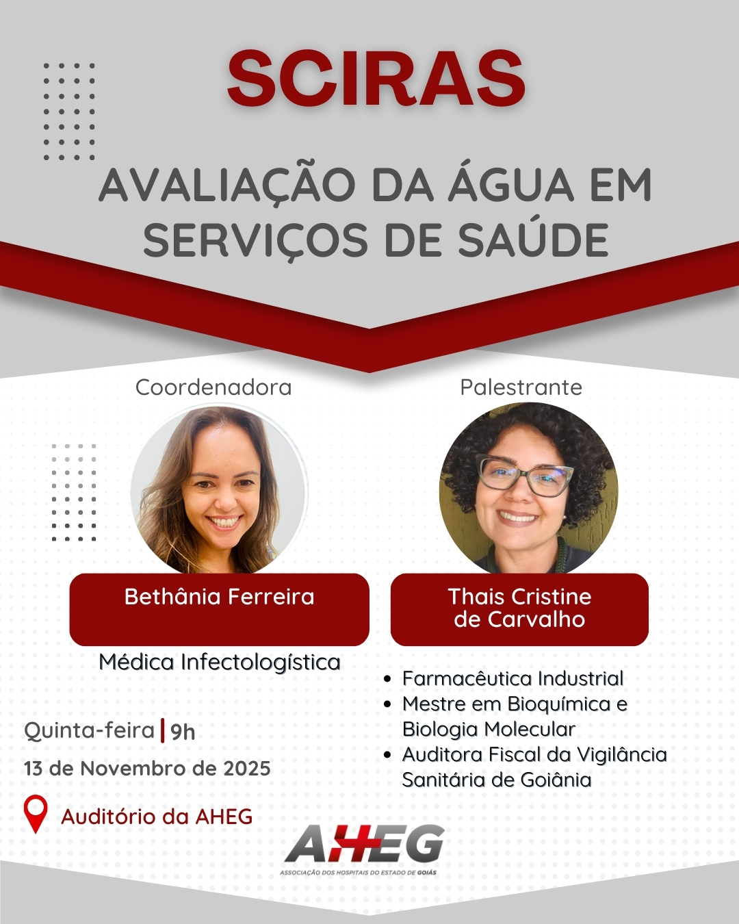 Para marcar o encerramento de seu calendário de palestras de 2025, a Consultoria em SCIRAS da AHEG promoverá uma aula especial em colaboração com a Vigilância Sanitária e Ambiental de Goiânia. O tema central será a Avaliação da Água em Serviços de Saúde e, pela primeira vez no ano, o evento acontecerá de forma presencial, no auditório da AHEG, no dia 13 de novembro, a partir das 9h.