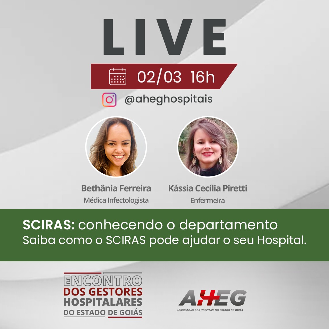 Com o tema "SCIRAS: Conhecendo o Departamento – Saiba como o SCIRAS pode ajudar o seu Hospital", a Associação dos Hospitais do Estado de Goiás (AHEG) inicia a sua série de lives 2023 no dia 2 de março, às 16 horas. A transmissão será aberta ao público em geral e feita por meio do canal da associação no Instagram: @aheghospitais.